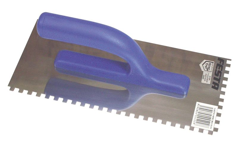 Hladítko nerezové zubové FESTA 280x130 mm, zub e6, s plastovou ručkou, tl.plechu 0,8 mm. Používá se zejména k nanášení lepidel pod obklady a dlažby, dále pak k nanášení stěrek, štuků, omítek, tmelů a dalších stavebních hmot. Hladítko nerezové zubové