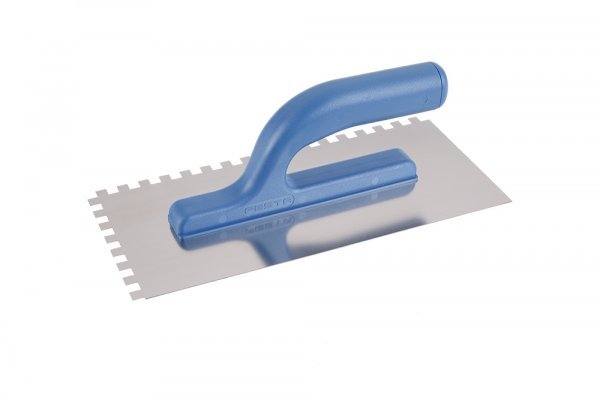 Hladítko nerezové zubové FESTA 280x130 mm, zub e8, s plastovou ručkou, tl.plechu 0,8 mm. Používá se zejména k nanášení lepidel pod obklady a dlažby, dále pak k nanášení stěrek, štuků, omítek, tmelů a dalších stavebních hmot. Hladítko nerezové zubové