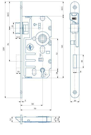 zádlab: 70mm rozteč: 72mm dorn: 50mm trn: 8x8mm čelo:220x20mm jednozápadový bez převodu = klíčem nelze otevřít střelku, nepoužívat pro kování klika koule ! součástí 1 klíč