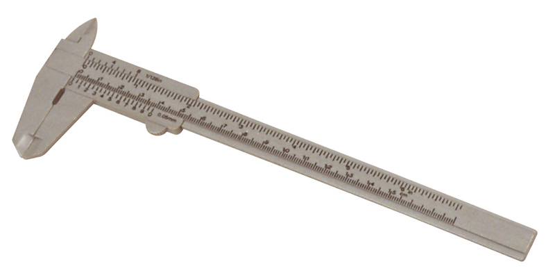 Plastové posuvné měřidlo 150mm, dělená stupnice v mm a palcích, pro orientační měření.