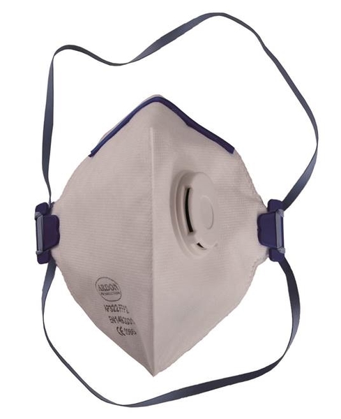 skládaný respirátor s výdechovým ventilkem s polypropylenovým filtračním médiem funguje na bázi elektrostatiky vnější vrstva z SMS textilie/polypropylenu, vnitřní vrstva z polyesteru nosní svorka a dvojitý upínací systém z přírodní gumy zajišťují vynikající těsnost měkká nosní pěna materiál: SMS textilie, polypropylen, guma norma: EN 149 filtrační třída: FFP2 barva: bílo-modrá