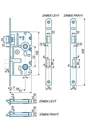 zádlab: 77mm rozteč: 72mm dorn: 55mm trn: 8x8mm + 6x6mm čelo:235x20mm jednozápadový bez převodu plastová střelka