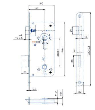 zádlab 80mm rozteč 90mm dorn 50mm trn: 8x8mm čelo:230x20mm dvouzápadový bez převodu = klíčem nelze otevřít střelku, nepoužívat pro kování klika koule ! součástí 1 klíč