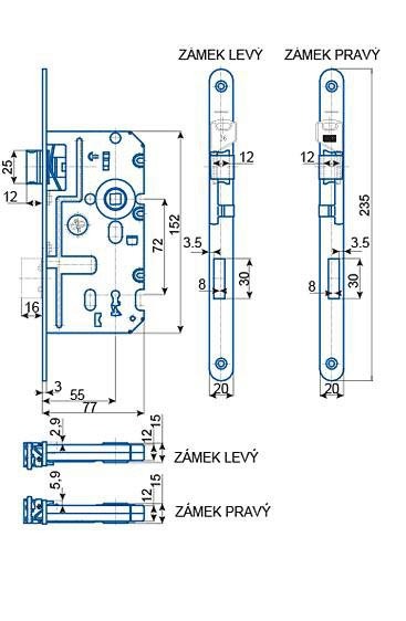 zádlab: 77mm rozteč: 72mm dorn: 55mm trn: 8x8mm čelo:235x20mm jednozápadový bez převodu = klíčem nelze otevřít střelku, nepoužívat pro kování klika koule ! součástí 1 klíč plastová střelka