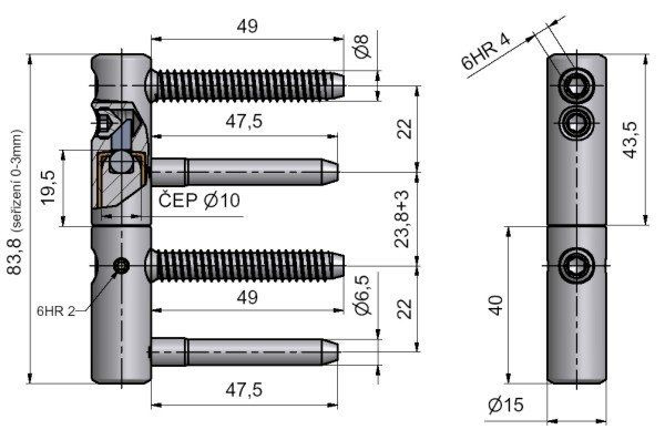 Únosnost / ks (v kg)33.00 Požární odolnost: ne Materiál (převažující): ocel Typ závěsu:Kompletní závěs Typ dveří: Interiérové Orientace dveří (okna) :Pro pravé i levé dveře (zárubeň) Provedení dveří: S polodrážkou Materiál dveřního křídla: Dřevo Typ zárubně Dřevo masiv Uchycení závěsuK zašroubování Průměr závitu svorníku: Speciální závit do dřeva o 8 Délka svorníku:49 mm Výška čepu 19,5 mm